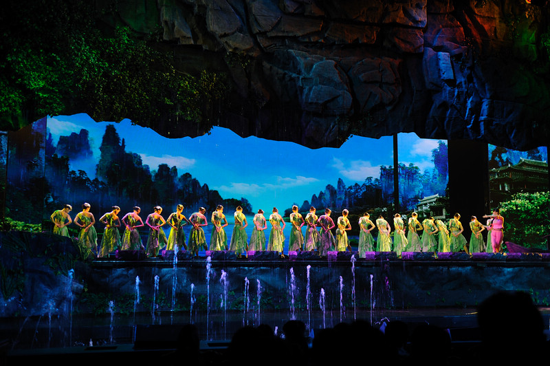 《天門(mén)狐仙》:位于張家界市區(qū)的大型山水實(shí)景音樂(lè)劇,以高山峽谷做舞臺(tái)背景、使用頂尖科技舞美燈光音響、融入了張家界獨(dú)特的民歌和土家的民俗,將古老的“劉??抽浴眰髡f(shuō)在美麗的天門(mén)山下演繹的淋漓盡致。