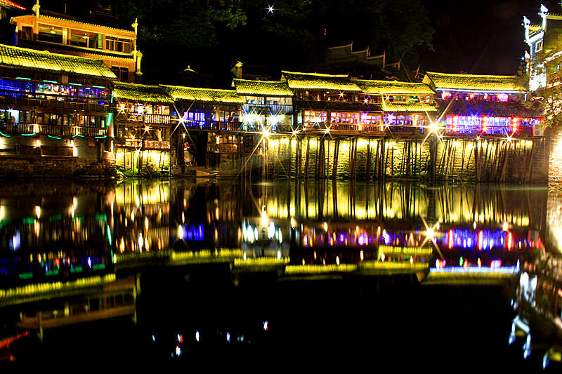 下午15:30左右BUS赴鳳凰,達到后自行游覽鳳凰夜景、漫步美麗的沱江邊。兩岸燈火闌珊,古城清幽而絢麗讓人留念往返。 |